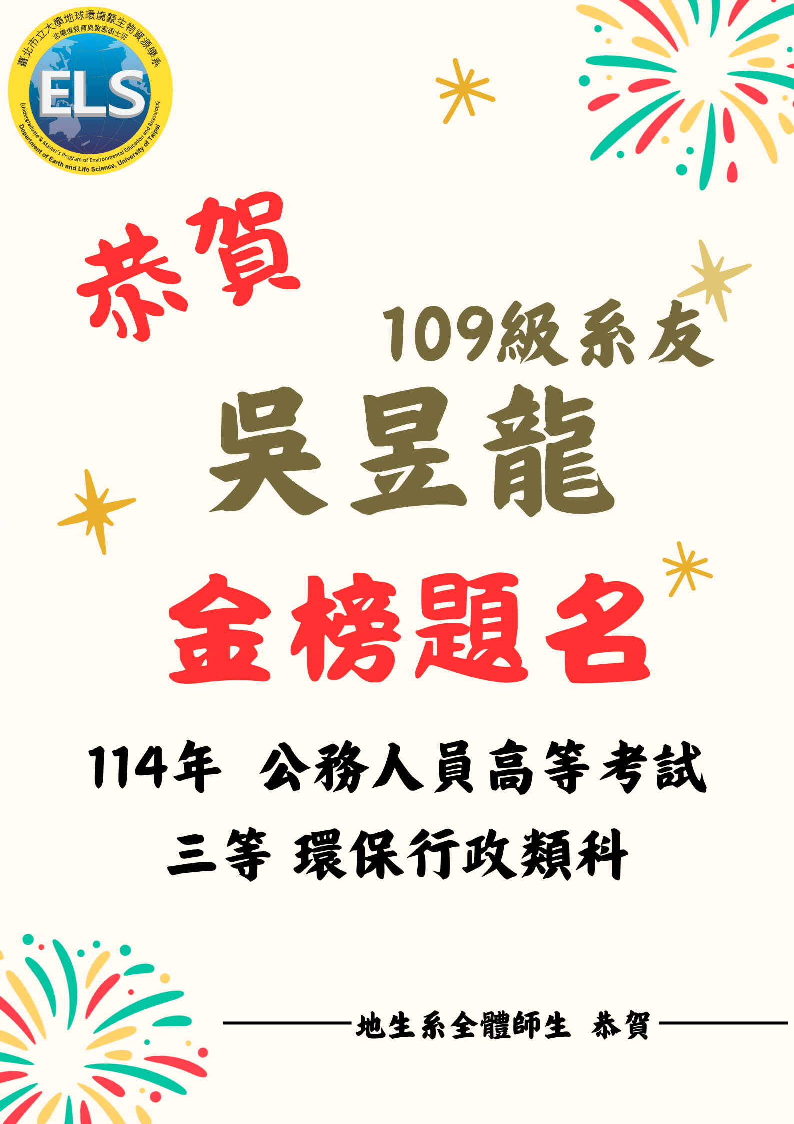 恭賀109級系友吳昱龍金榜題名114年公務人員高等考試 三等 環保行政類科