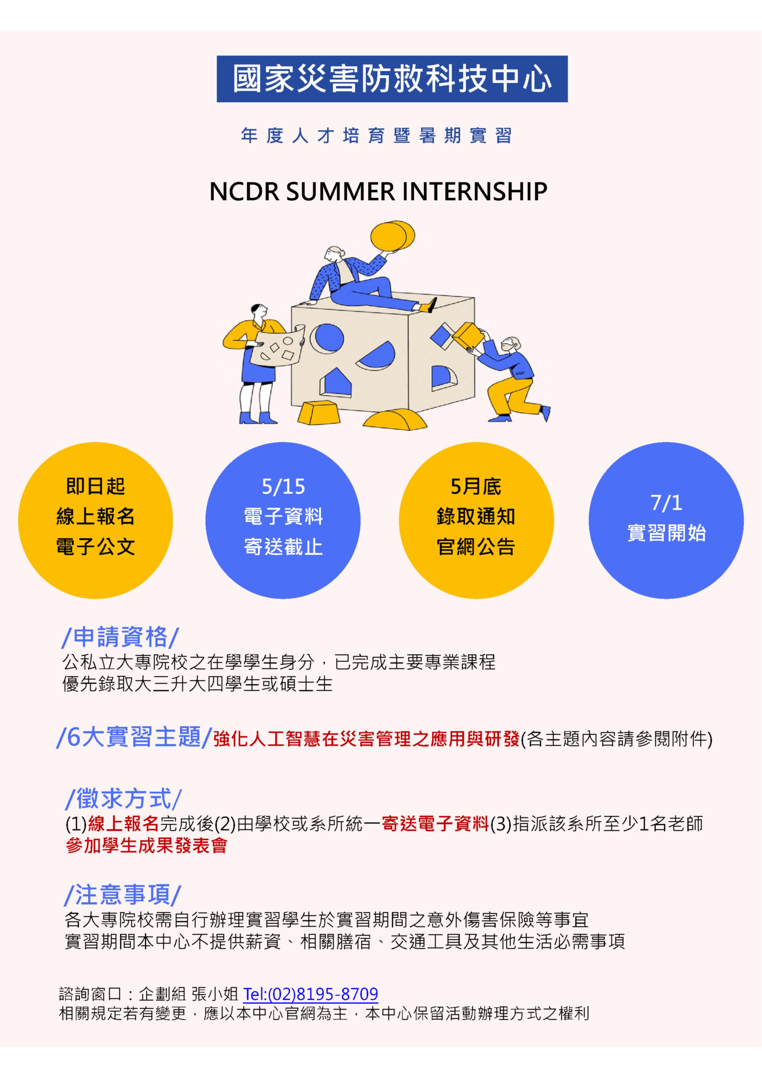 說明: 2026年國家災害防救科技中心暑期實習徵選活動已經開始囉,相關資訊如附件。 詳情亦可點選中心網頁-「最新消息」處。 https://www.ncdr.nat.gov.tw/Message?itemid=57&mid=70